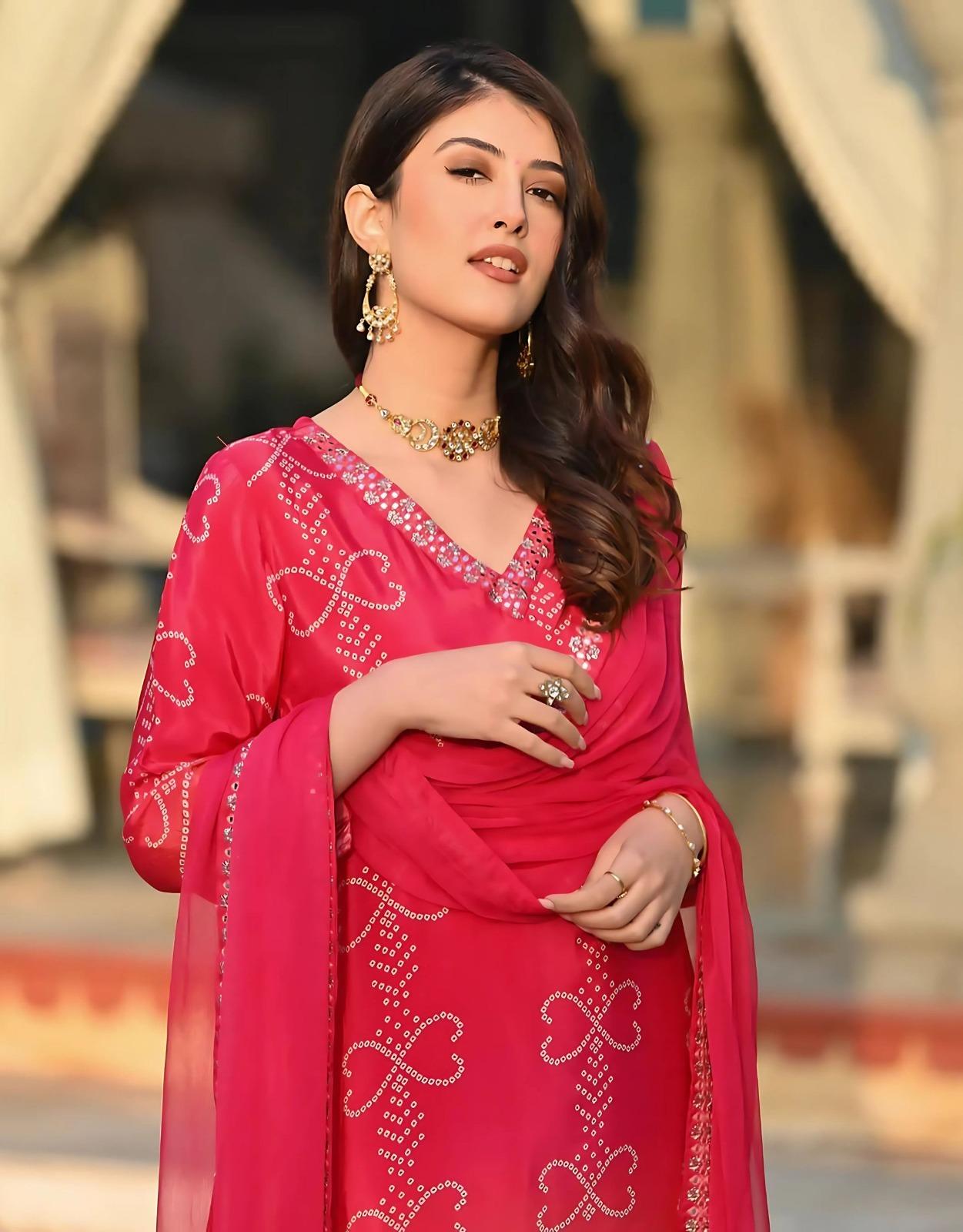 DIGITAL PRINT FABRIC CHINON KURTHI,PANT AND DUPPATA HEAVY MIRROR WORK ON NECK AND SLEEVES,V NECK MODEL